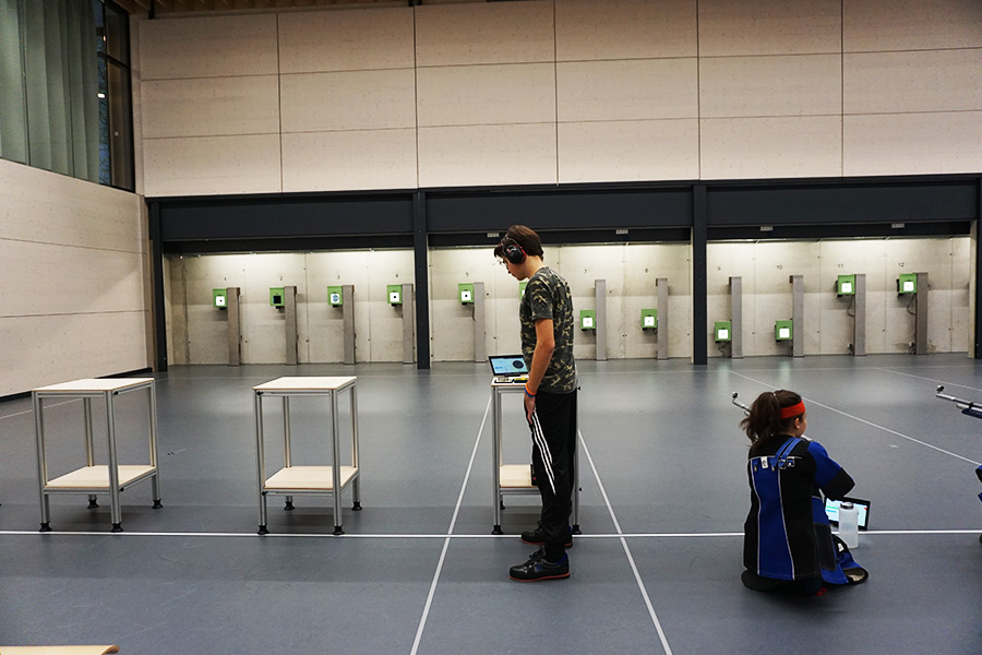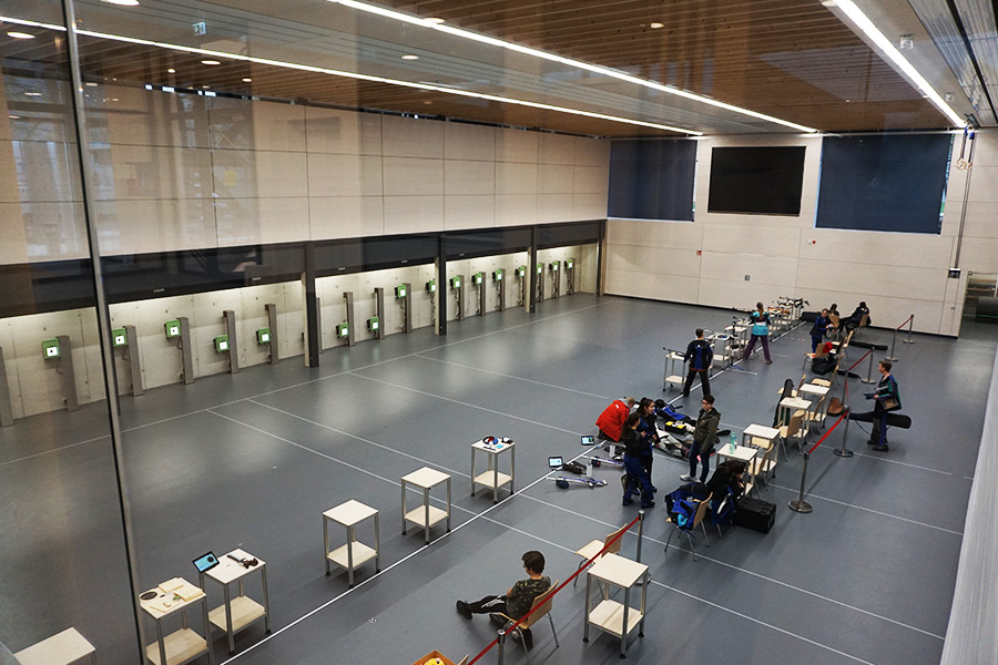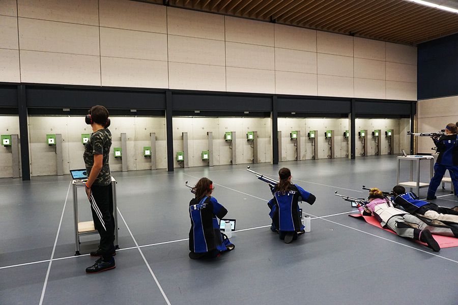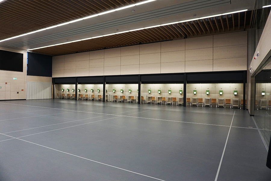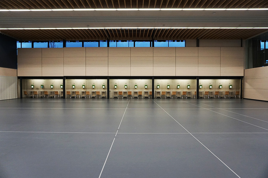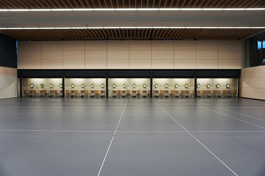 Die vollautomatische HubWand fährt mit einem einfachen Knopfdruck nach oben und legt die Zielscheiben und Trefferanzeigen frei. Sie verbirgt dabei die über den Zielscheiben liegende Fensterfront und fungiert als Sonnenblendschutz für die Schützen. Sobald die Halle anderweitig gebraucht wird, kann die HubWand wieder hinunter gefahren werden und verschmilzt dabei mit der Hallenfassade – wie ein Chamäleon.
