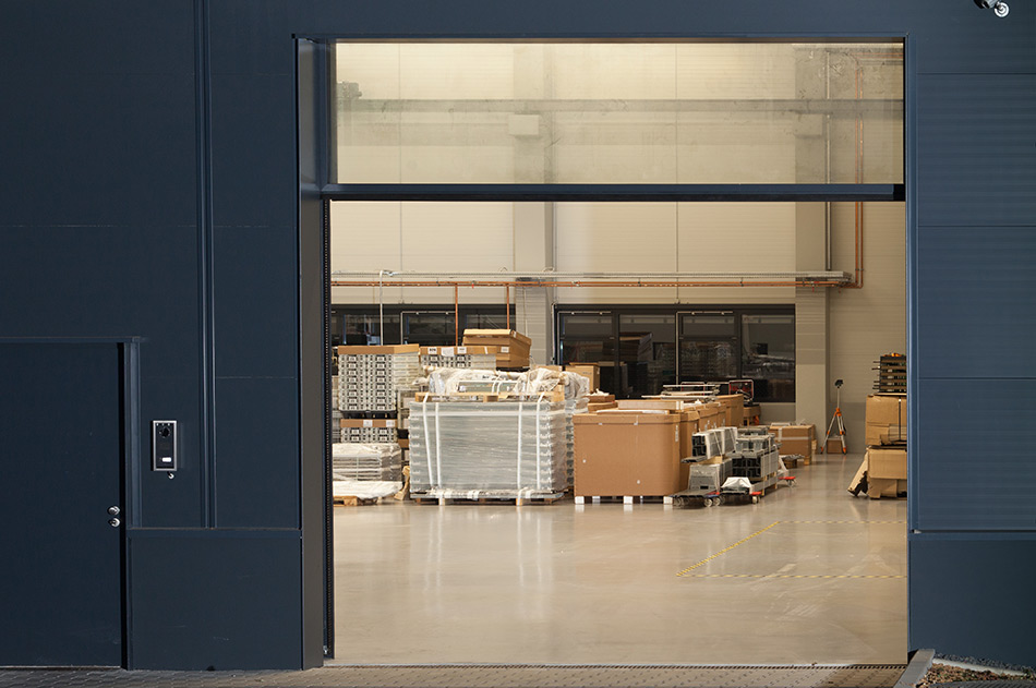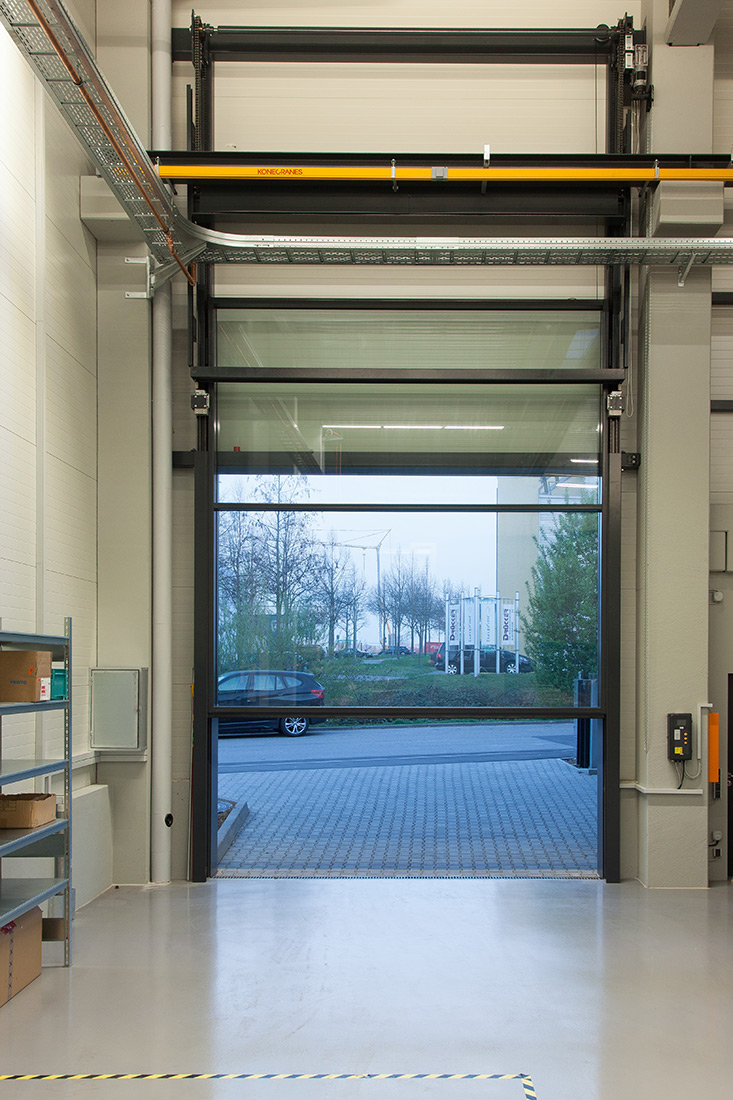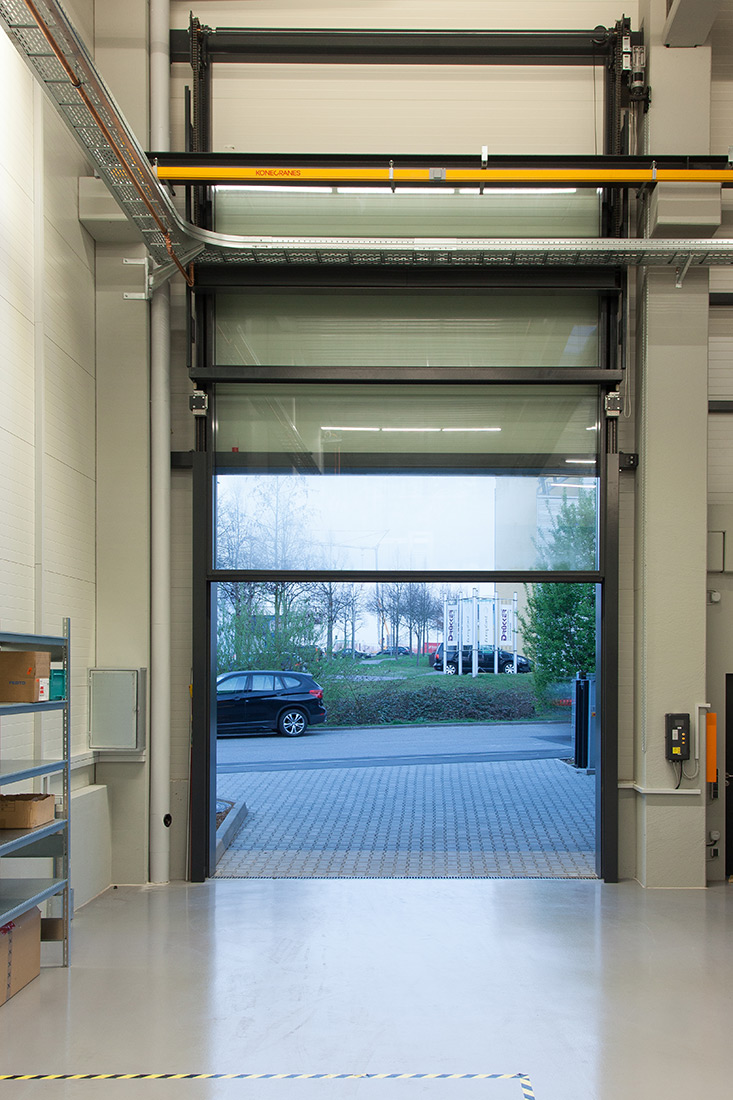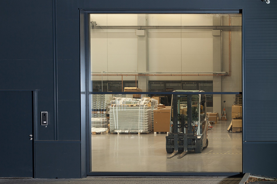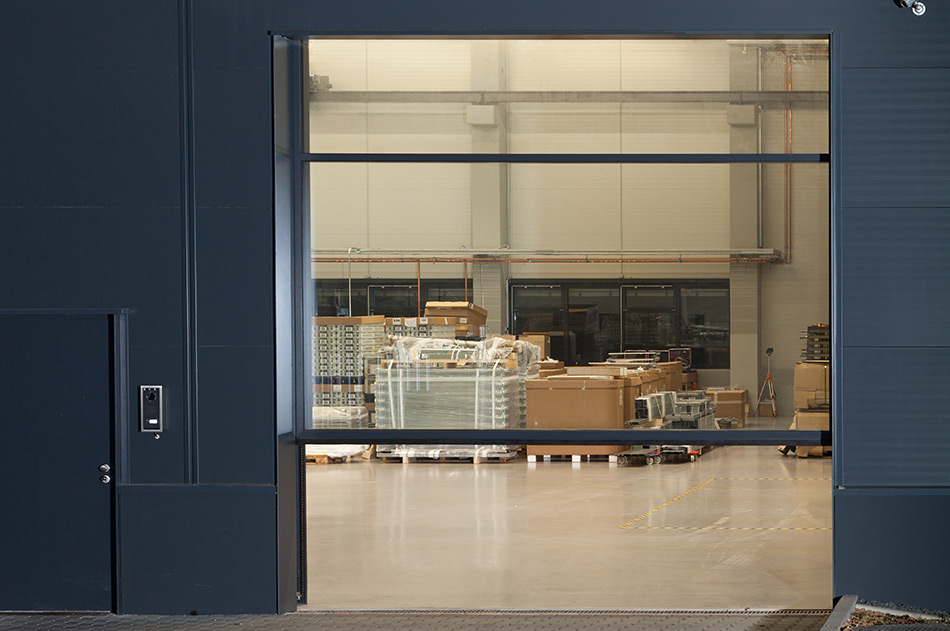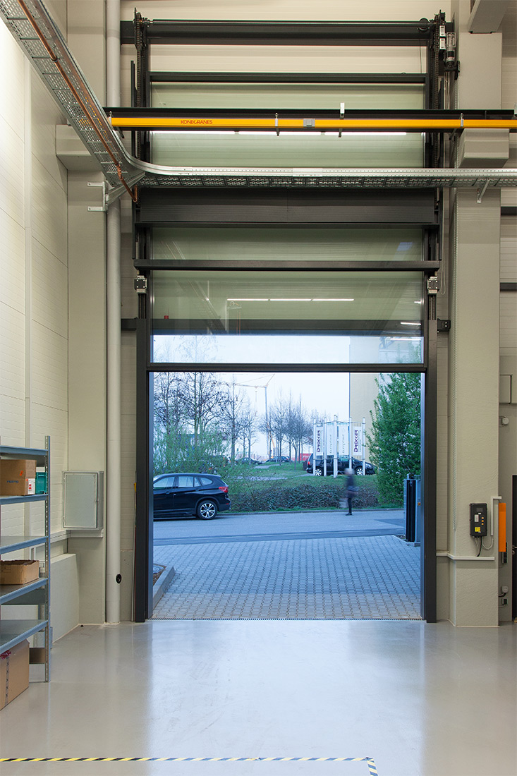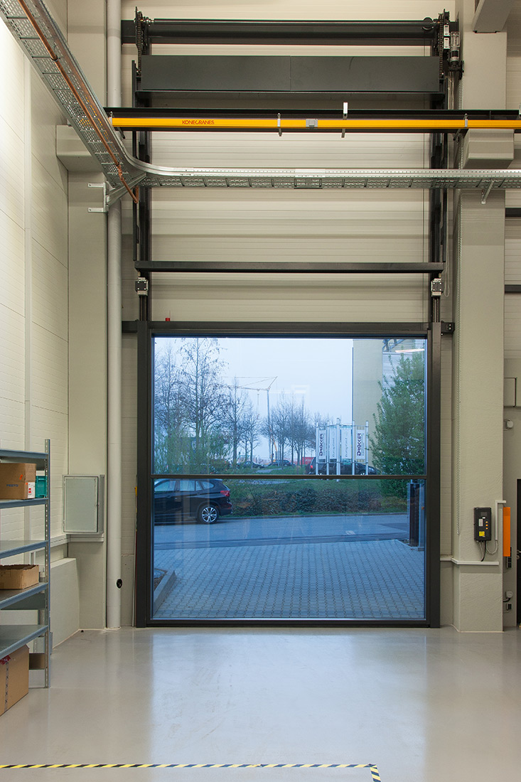 LOSCH hat durch den Einsatz von 16 m² Isolierglas eine wetterbeständige, lichtdurchlässige HUBWAND kreiert, die für ein CNC-Betrieb als Waren Ein- und Ausgang dient. Die HUBWAND ist 4 x 4 m groß und weist ein Flügel- und Gegengewicht von 1.200 kg auf. Ein Motor von 1,1 kW mit einer stufenlosen Steuerung sorgt nicht nur für die Endgeschwindigkeit eines Industrietores, sondern auch für sanftes Losfahren und Anhalten.