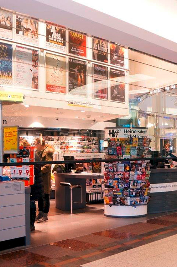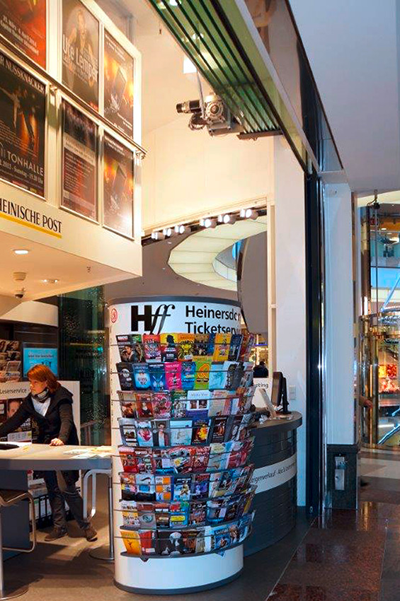 Hollmann Buch & Presse verfügt über eine Ladenfläche von ca. 60 Quadratmetern. Zum bestehenden Produktsortiment waren der Ticketservice sowie die Anzeigenannahme für die Rheinische Post hinzugekommen. Welzel erklärt: „Es war notwendig, die Gestaltungsanforderungen der Schadow Arkaden einzuhalten und gleichzeitig eine repräsentative Möglichkeit für die Einbeziehung der Shopping Mall zu finden. Um die Integration der Passage zu gewährleisten, musste eine Lösung für eine mobile Glaswand mit großer Spannweite gefunden werden.“ Und um diese Herausforderung im Sinne einer ästhetischen und transparenten Raum-in-Raum Architektur erfolgreich zu meistern, beauftragte der Architekt die LOSCH Wandsysteme GmbH.