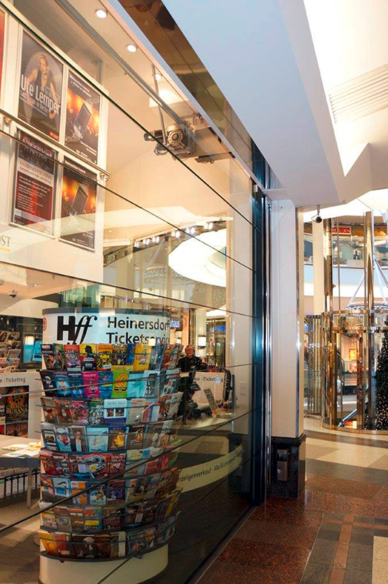 Für das Geschäft in den Schadow Arkaden wurde eine Ganzglas-LOSCHWAND des Typs GG/500 ausgewählt. Die über sechs Meter breite und fast vier Meter hohe Glaswand, welche der Ladenfront angepasst wurde, besteht aus acht verfahrbaren Glasscheiben, die durch einen leisen Elektromotor mit einer Motorleistung von 1,4 kW vertikal nach oben und unten fahren. Bei Ladenöffnung stapelt sich die LOSCHWAND innerhalb weniger Minuten sichtbar unter der Decke. Der Verkaufsraum ist somit barrierefrei für Kunden zugänglich. Bei Ladenschließung fährt die Glaswand per Knopfdruck herunter und schließt flächenbündig und sicher ab. Durch die qualitative und innovative Trennwandlösung ist das Fachgeschäft in kürzester Zeit optimal in die Architektur der Schadow Arkaden integriert worden. Der Buch- und Tabakwarenshop wirkt durch die repräsentative Glasfassade hell und einladend.