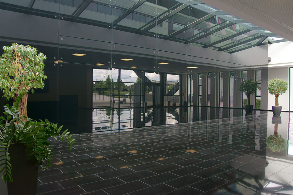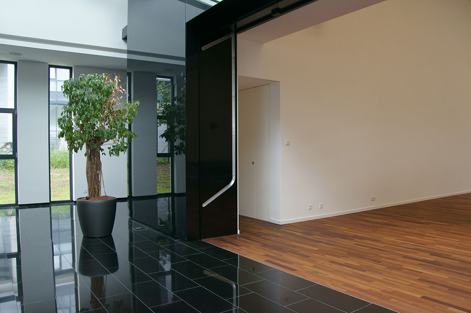 Für die Verbindung bzw. Trennung von Foyer und Konferenzraum kam die HubWand von LOSCH Wandsysteme in einer Sonderanfertigung zum Einsatz. Die schwarze Hochglanz-HubWand ist ein einziges Element – und in die Raumgestaltung aus schwarzem Glas unsichtbar integriert. Das Besondere an dieser Lösung ist, dass die Glasfassade im Gebäude „bündig“ mit dem beweglichen Glas der HubWand abschließt. Die bewegliche HubWand kann man von Außen nicht erkennen, und es scheint alles aus einem Guss zu sein. In geschlossenem Zustand ist die große schwarze Glasfassade in einer Linie mit dem beweglichen Teilelement.