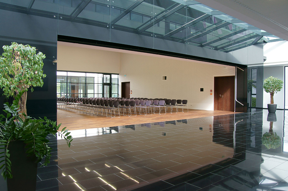 Eine Herausforderung für den Hersteller LOSCH Wandsysteme aus dem Baden-Württembergischen Neckartenzlingen, seine bekannte HubWand-Technologie in dieser Dimension – 48 Quadratmeter fahrbare Glasfläche – zu realisieren. Eine Lösung für diese Aufgabe wurde in Zusammenarbeit mit Spezialisten für Stahlleichtbau, Franz Hesedenz GmbH aus Saarlouis, entwickelt. Hesedenz verfügt über langjährige Erfahrung und Kompetenz im Metallbau; LOSCH Wandsysteme ergänzt dieses Wissen mit 30jährigem Know-how als renommierter Hersteller für verfahrbare Trennwände. Der Vorschlag wurde den Architekten und Bauherren präsentiert, und das Ergebnis überzeugte durch seine innovative Technik ebenso wie durch Funktionalität und ästhetische Aspekte.