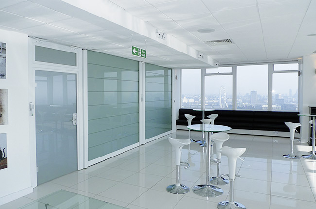 Das Altitude Business Center liegt im Herzen Londons. Mit der 360°-Rundumsicht ist es ein idealer Ort für Veranstaltungen. Hier ermöglicht die LOSCH Schallschutzwand eine flexible Trennung der Räume für parallele Veranstaltungen und Business-Events. Bei diesem Beispiel trennt und verbindet die vollautomatische LOSCHWAND® mit Schallschutz und verschiebbaren Türen den kreisförmigen Veranstaltungsraum und die Theke.